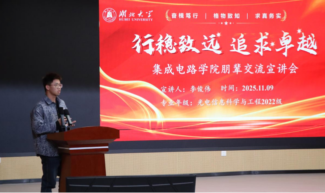 (通讯员:张怡)榜样立芯传薪火,朋辈引领启新程。11月9日晚,湖北大学集成电路学院在长江新区校区学术报告厅成功举办新生入学教育系列活动暨“遇见‘芯’榜样”朋辈交流宣讲会。院党委副书记田务民、2022级优秀学生代表及2025级全体本科新生参会。