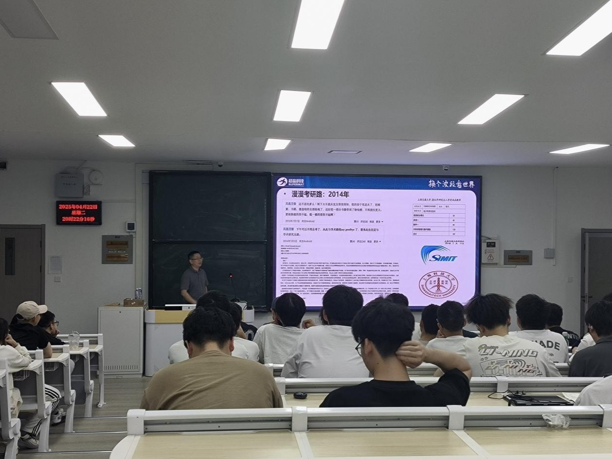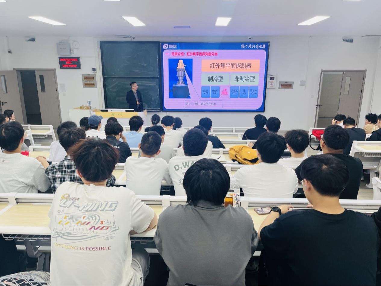 报告伊始,张凡博士立足国家战略需求,系统梳理了超晶格红外焦平面探测器在军事、工业、航空航天以及医疗等关键领域的广泛应用,并详细阐述了当前该领域面临的技术瓶颈。他从半导体器件物理和微电子工艺的角度出发,深入剖析了超晶格红外焦平面探测器的工作原理以及科研产业界的前沿动态,使复杂的理论知识变得通俗易懂,让在场师生受益匪浅。在分享个人经历时,张凡博士介绍了其在宁波超晶光电科技有限公司组建国内首个新型化合物半导体红外焦平面探测器批量生产研发团队的历程。他带领团队成功实现了基于二类超晶格技术的红外焦平面探测器产品的定型和批量生产,为我国在该领域的技术突破做出了重要贡献。张凡博士还强调:“超晶格红外焦平面探测器让我们换个波段看世界,其发展直接关系到国家安全和民生福祉。”他还指出,当前光电探测产业链仍存在诸多“卡脖子”技术问题,而行业对电科、光电、微电子和集成电路人才的需求正急剧增加。他鼓励在场学生珍惜在校时光,学好每一门基础课和专业课,并以自身经历为例,阐述了扎实的专业知识在实际工作中所发挥的关键作用:“等你们毕业后从事生产研发工作,就会深刻体会到当年为什么要学习量子力学、固体物理学和半导体物理等课程。”