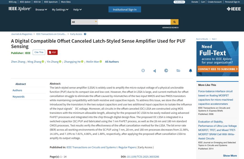 近日,我院博士研究生张震在国际电路与系统领域旗舰期刊IEEE Transactions on Circuits and Systems I: Regular Papers (TCAS-I)上发表论文,论文题为“A Digital Compatible Offset Canceled Latch-Styled Sense Amplifier Used for PUF Sensing”。 本文提出的OC LSSA基于最小栅长的MOS晶体管实现,便于兼容先进工艺与数字设计流程,并有效降低 PUF 的偏置与误码率。